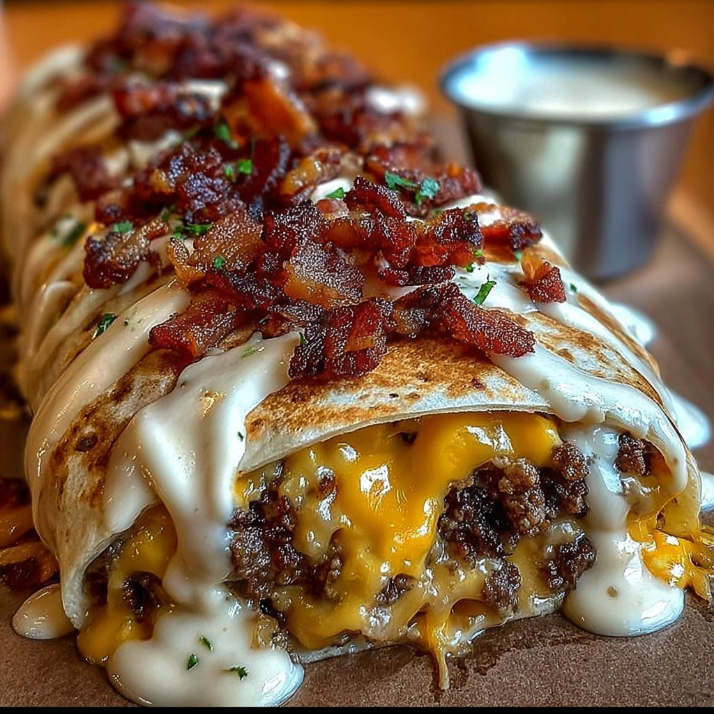 Huge Bacon Cheeseburger Burrito with Creamy Cheese Sauce